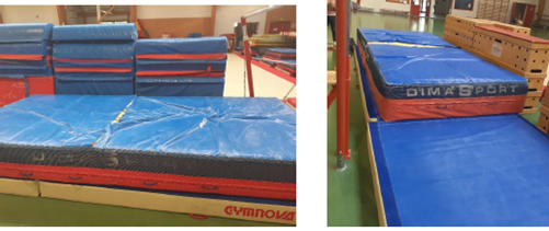 En effet, les gros tapis de réception DIMA sont très abîmés, voir fendus pour certains. Il s’agit des gros tapis dont nous nous servons pour les réceptions aux barres, en bout de piste gonflable, au saut etc.